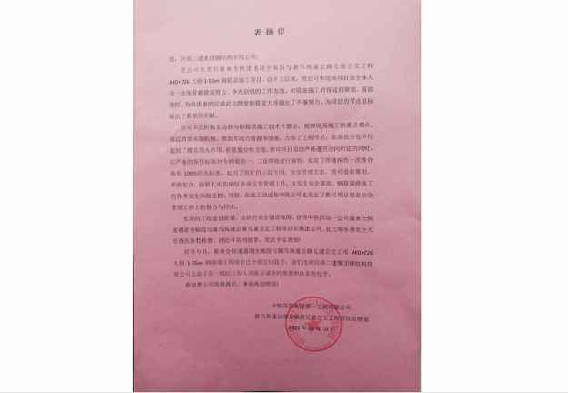 中铁四局集团第一工程有限公司向哈尔滨维思资源开发有限公司发来表扬信